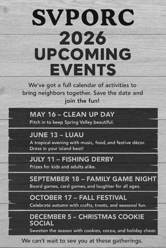 Thank you to all that attended the holiday social. It was good to see so many happy faces, connect with everyone and meet some new neighbors. Everything looked so festive, and the cookies and hot cocoa were delicious. Thank you to the Spring Valley Activities Committee and volunteers for coordinating this wonderful gathering.